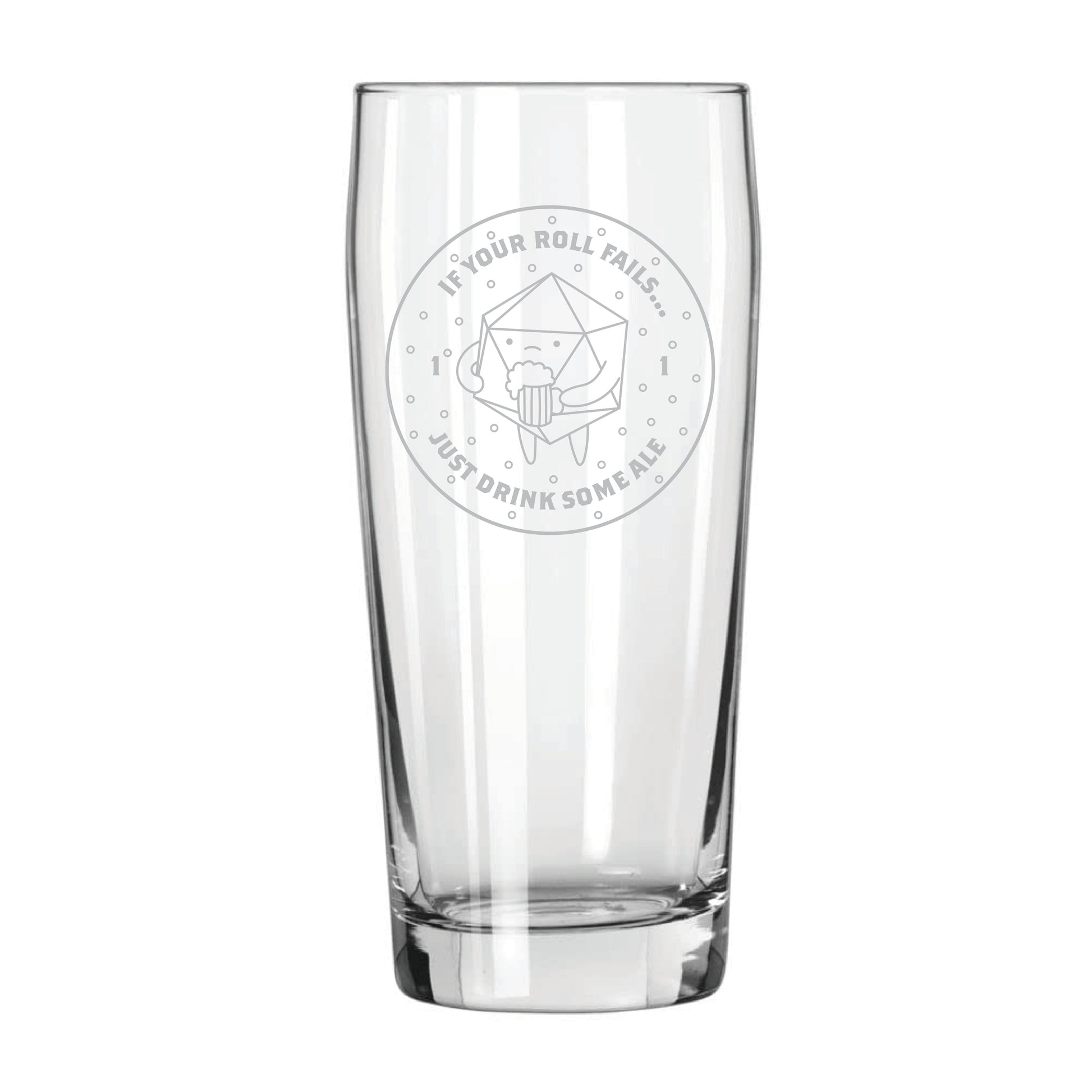 The image engraved on the glass is of a 20-sided dice drinking from a stein and surrounded by beer bubbles. The text around the dice reads "if your roll fails... just drink some ale."