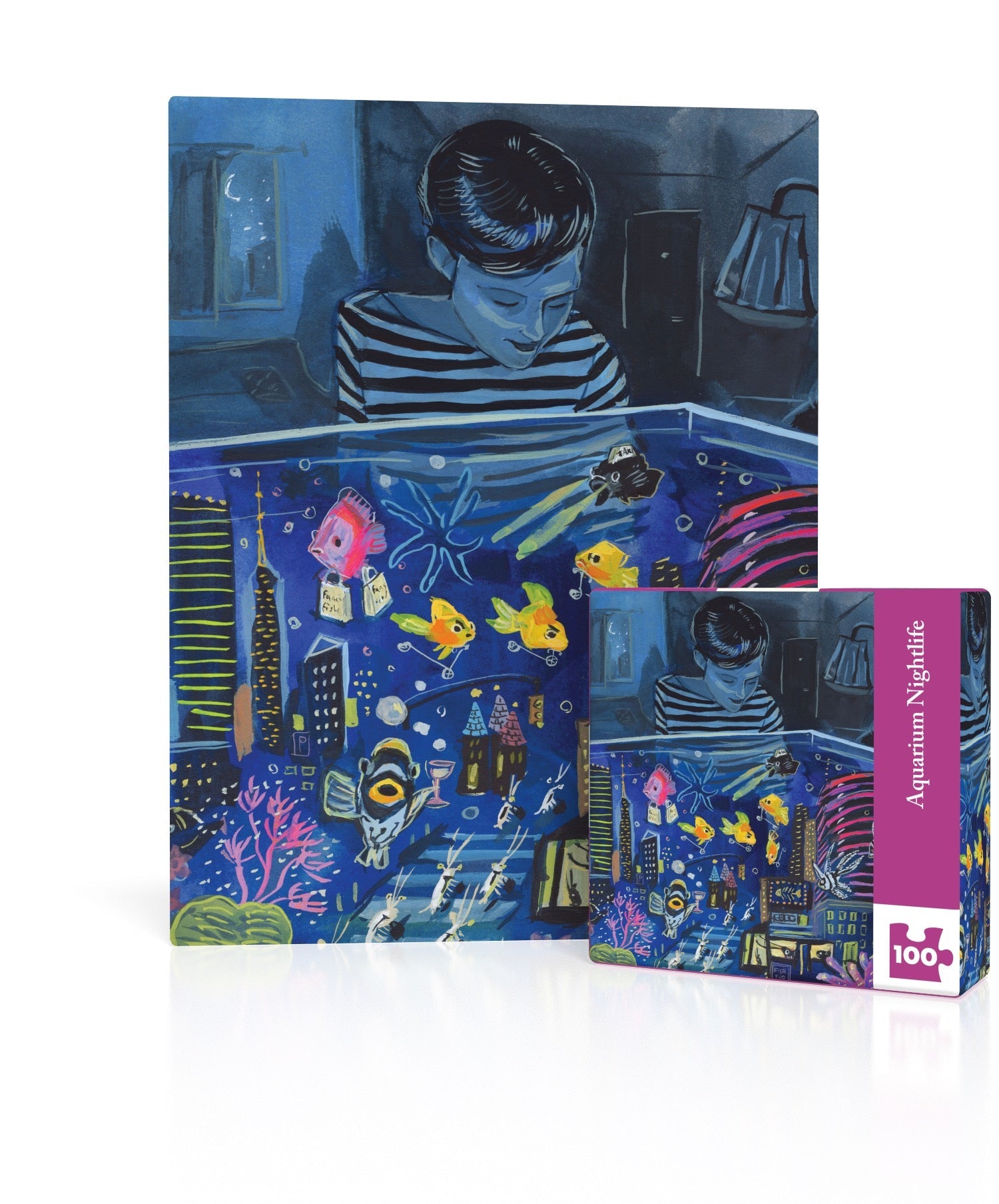 Step into a world of imagination and vibrant color with the Aquarium Nightlife 100 Piece Mini Puzzle, illustrated by the talented Jenny Kroik. This whimsical scene features a woman mesmerized by her fish tank in a room bathed in black light. In her vivid imagination, the aquarium comes to life as the fish embark on elaborate evening adventures: some driving cars, others zipping by on scooters, sipping cocktails, or marching through bustling underwater city streets.