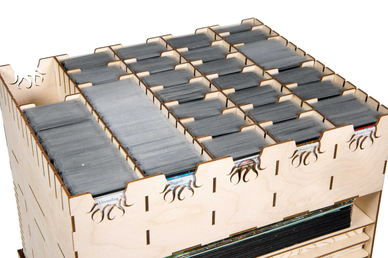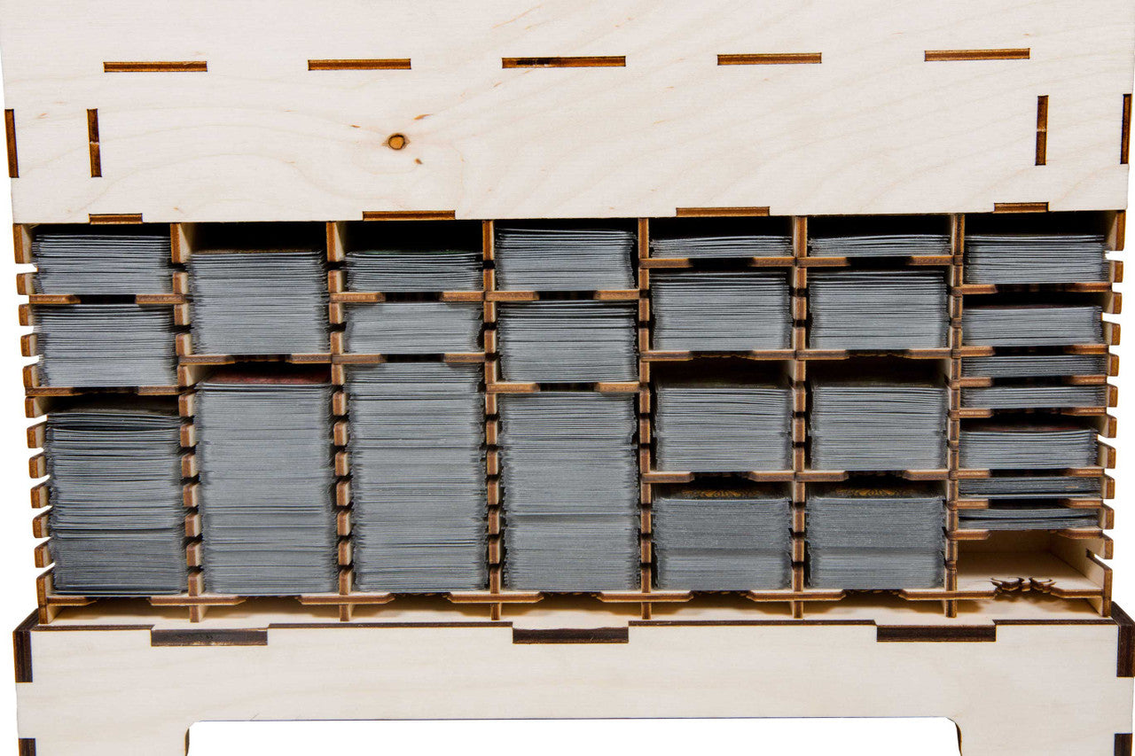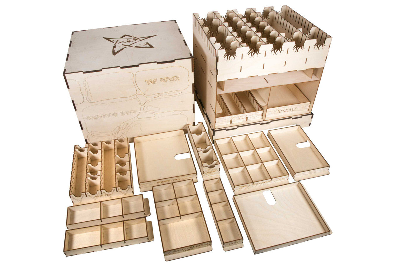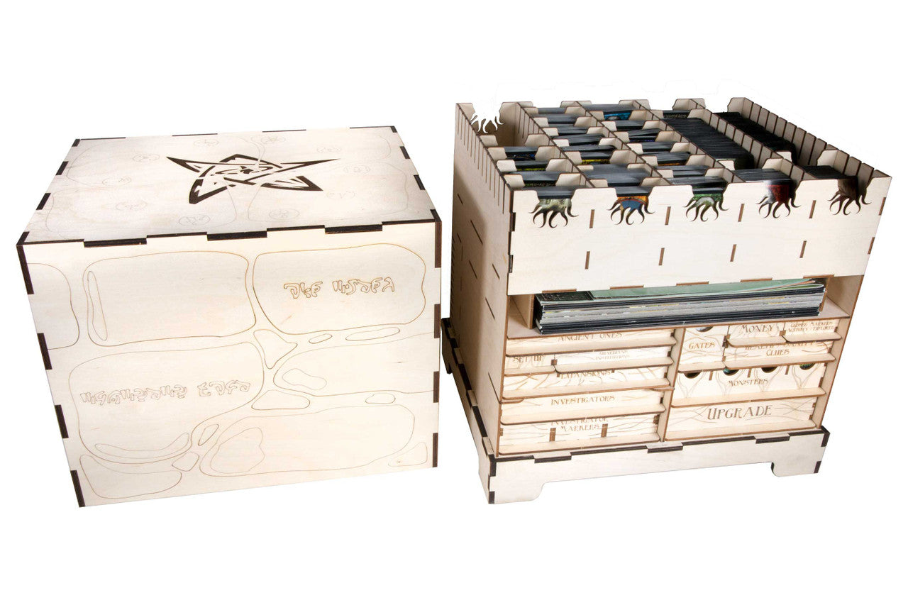 Get out on the streets of Arkham faster and wrap your investigations up with ease using our Arkham Horror Game Crate compatible with the 2nd Edition of Arkham Horror from Fantasy Flight Games. This crate is designed to store all of your tokens, markers, cards, and more within a premium wooden crate engraved with thematic art. Includes 23 large card section dividers and 20 small card section dividers.