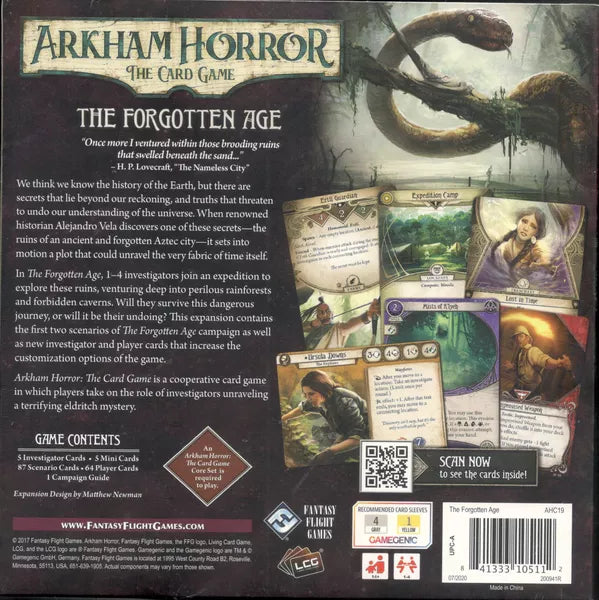 The Forgotten Age is the third deluxe expansion for Arkham Horror: The Card Game. Here, your team of investigators embark on a scientific expedition to the rainforests of Southern Mexico in two new scenarios, each of which can be played as a standalone adventure or can act as the beginning of a new campaign for your team. This expansion introduces five new investigators to Arkham Horror: The Card Game along with sixty-four player cards and eighty-seven encounter cards, including an all new exploration deck that presents new challenges for you to overcome as you find yourself falling into The Forgotten Age.