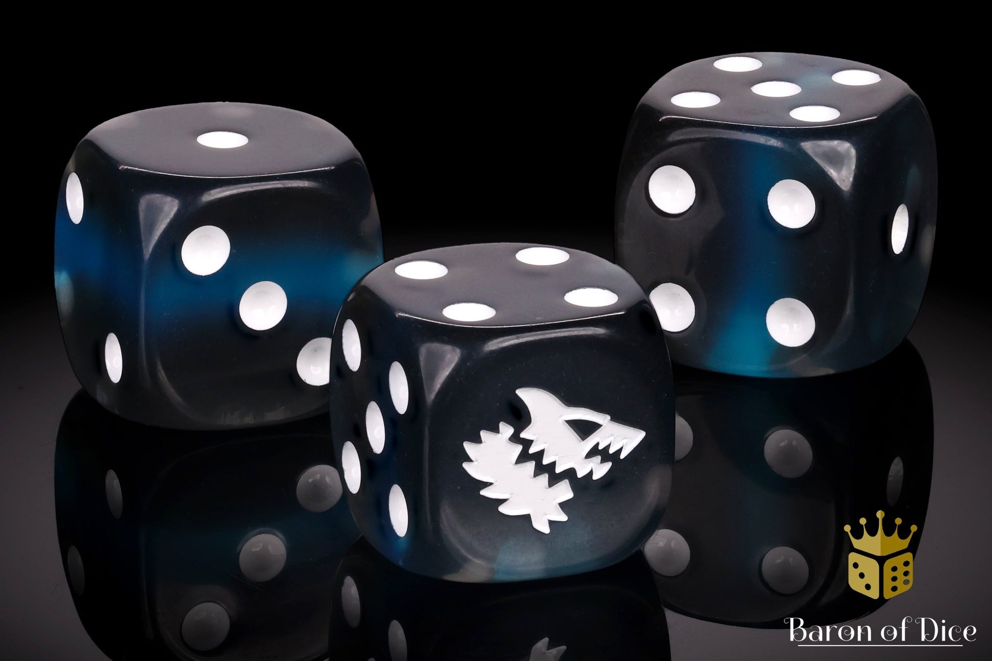 These contain a layered translucent black ice and a rich oceanic blue in between and inlaid in a pure white; resin hand-swirled dice. The symbols are on the 6 side. Our premium dice now come in a unique reusable tin.