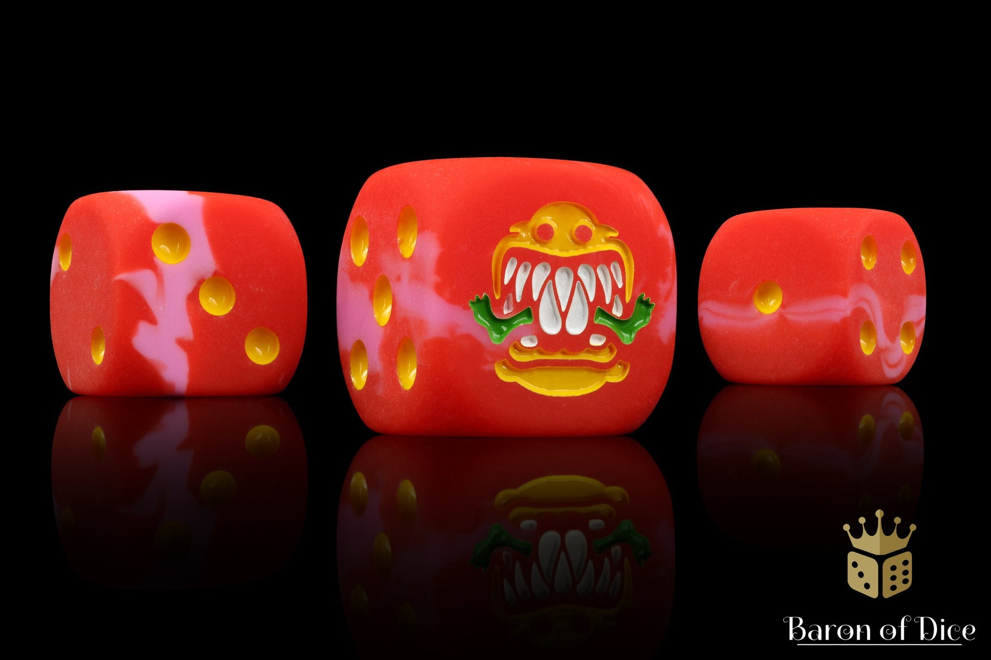 Do you dare to enter their cave? These contain a mixture of bright ferocious reds with veins of purple peaking through and our first ever, triple-toned inlay featuring a vibrant yellow, shiny white teeth, and an unfortunate goblin green; resin 16mm dice. The symbols are on the 6 side. These dice have an option of round corner or square corner; choose wisely! All our dice now come in a unique reusable tin!
