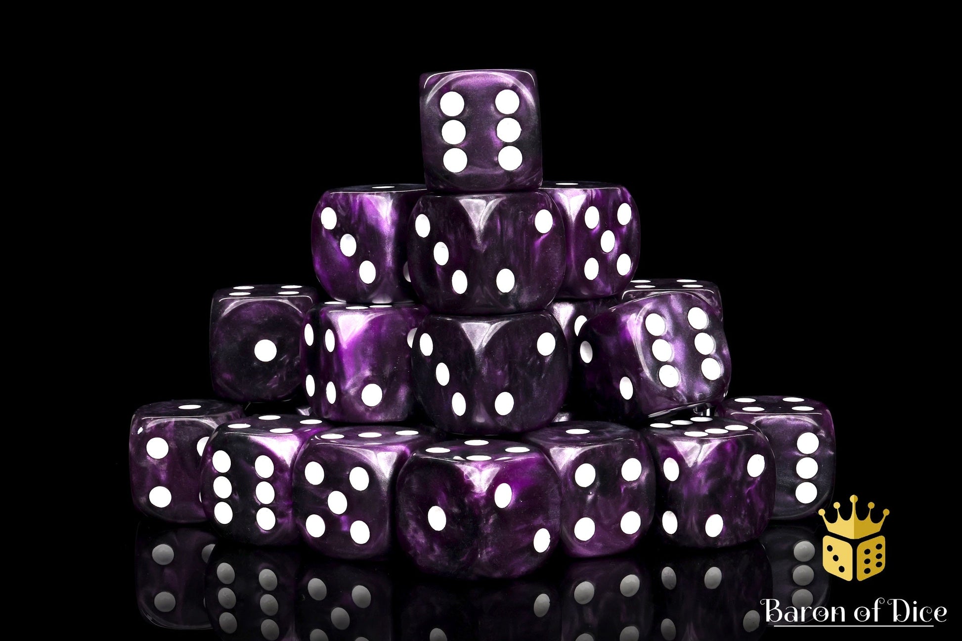 The galactic fleet approaches... These contain a mix of space alien purples swirled with deep warp black hues and inlaid with a bright white; resin 16mm dice. The symbols are on the 6 side. These dice have an option of round corner or square corner; choose wisely! Our premium dice now come in a unique reusable tin!