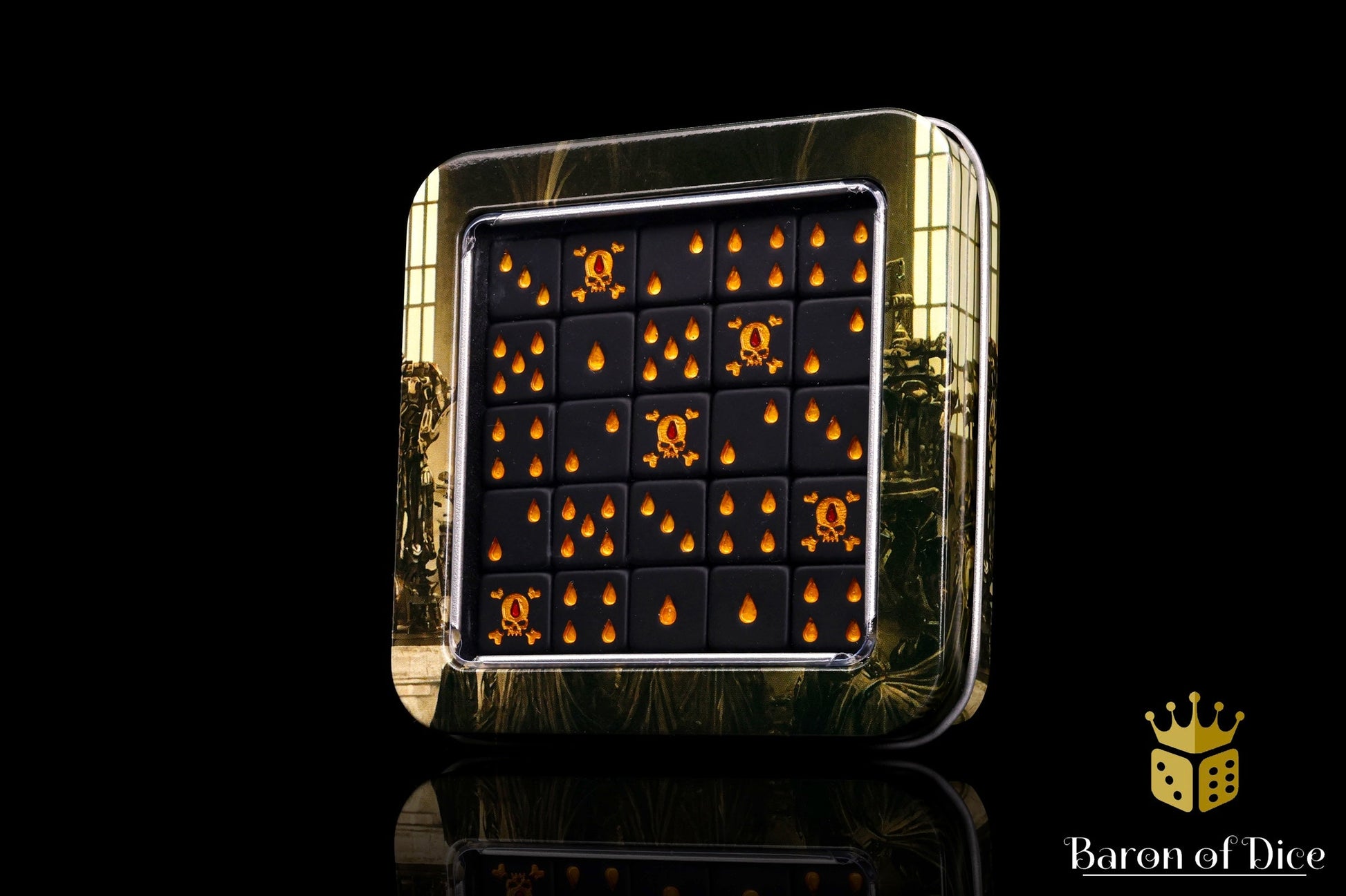These contain a base of matte black, grim and unnerving, and inlaid with a two-toned metallic gold skull and red blood drop; hand-swirled resin dice. The symbols are on the 6 side. These dice have an option of round corner, square corner, or 12mm mini, choose wisely! Our premium dice now come in a unique reusable tin.