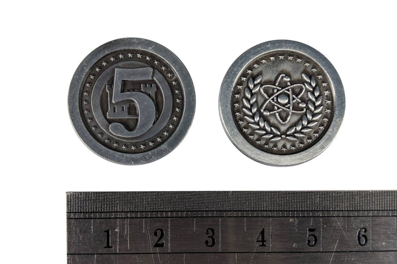 The Atomic Age 5 Value coins are circle shaped and have an antique silver finish.