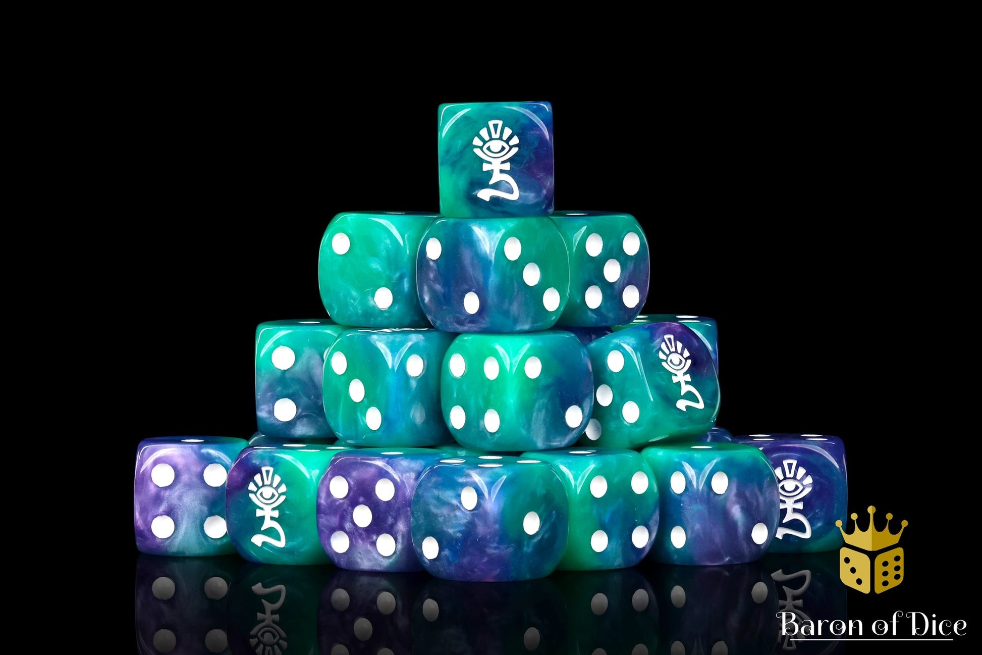 These contain a mix of lustrous teals, purples and ethereal green hues swirled with a pearlescent finish and inlaid with an easily readable white; resin 16mm dice. The symbols are on the 6 side. These dice have an option of round or square corner, choose wisely! Our premium dice now come in a unique reusable tin.
