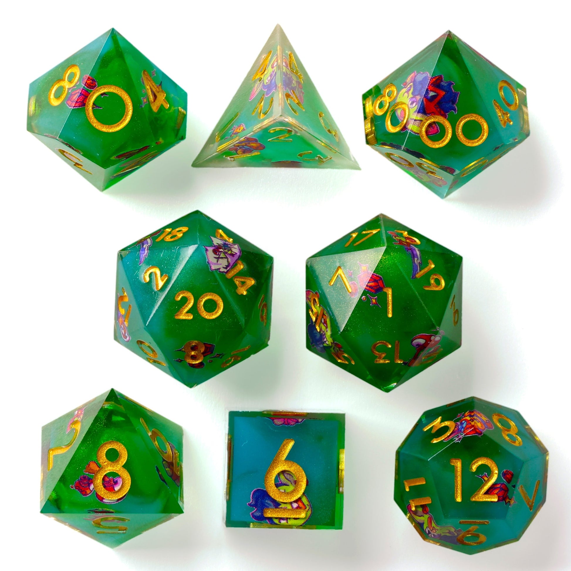 Hand-drawn original artwork on every die — illustrations etched into resin for depth and character.