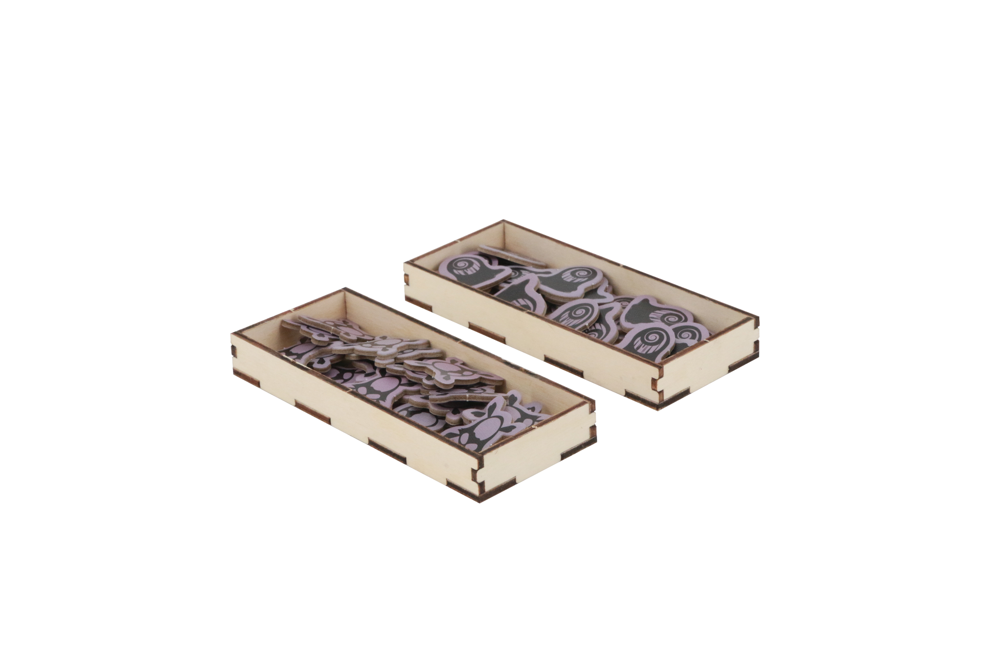 This organizer has multiple removable trays to help make your game set up fast and easy. The fear and blight trays can be removed from the box and immediately put onto the board. Each player has a tray to hold their starting tokens. Two card trays hold the island's spirits, fear, and the minor and major powers. And resource trays to keep the gameplay tokens organized and easily accessible during play.