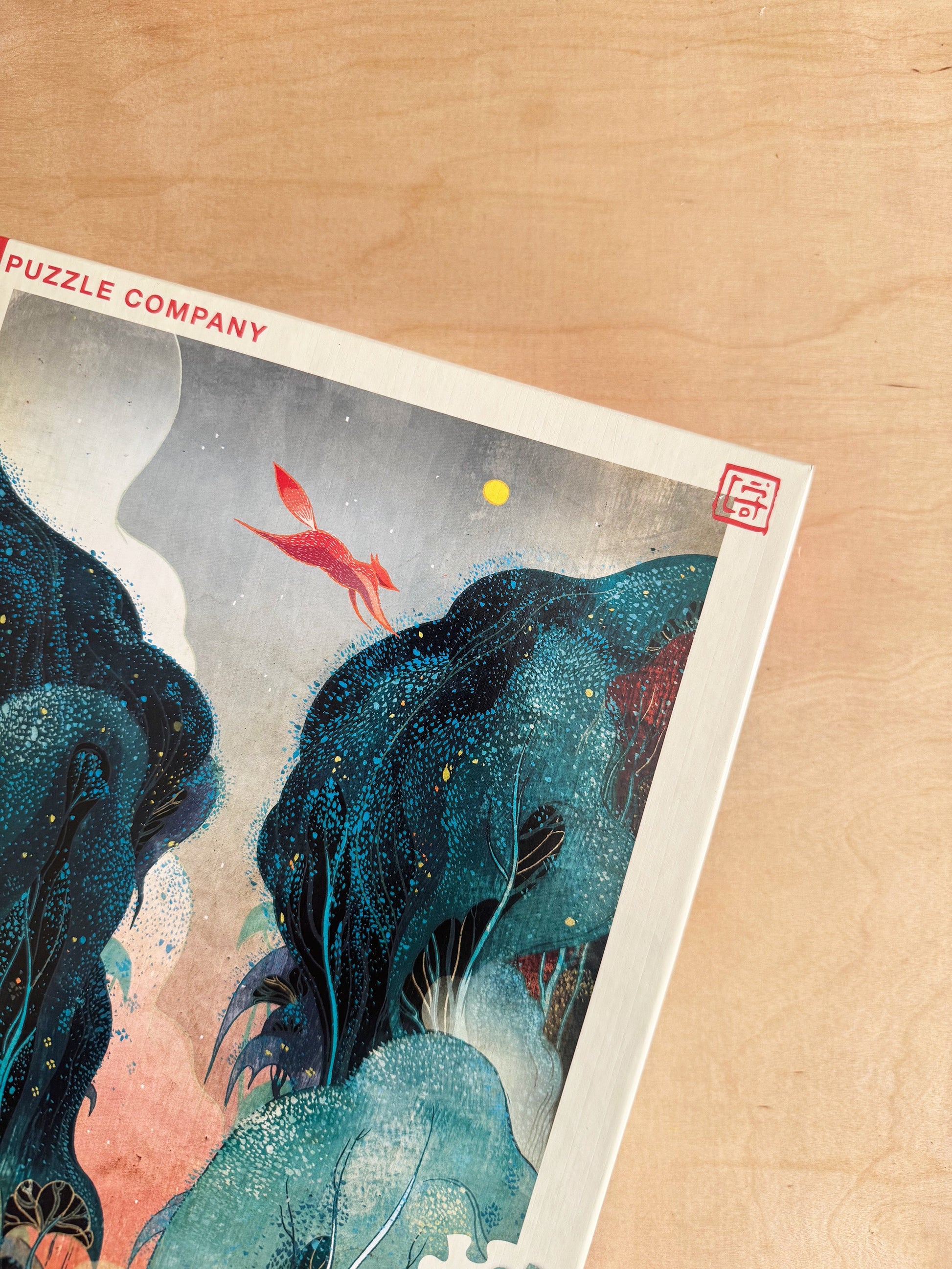 A red fox leaps from one tree to another in this beautiful lush scene.