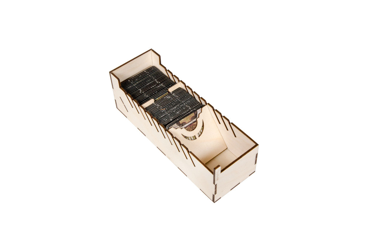 Those familiar with our original Deepwater organizer will notice additional removable trays, including a card tray, tile tray, 2 token trays, and 6 adventurer trays. This all contained in an outer crate constructed of heavy duty 1/4" Baltic Birch, naturally beautiful or ready to sand and stain for a truly custom appearance. Handle cutouts make this crate easy to transport. Supports sleeved and unsleeved cards. Includes 5 adjustable card dividers.