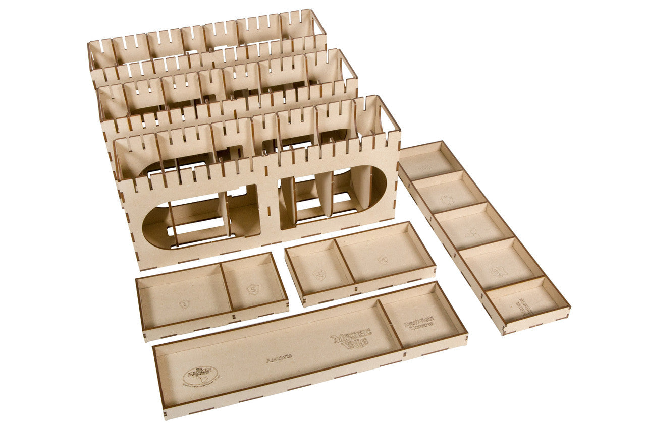 This organizer compatible with Mystic Vale: Conclave, crafted from precision cut MDF will hold the base game, existing expansions, and room for additional content. Fits inside the Mystic Vale: Conclave outer box, keeping your cards from sliding around with 15 movable dividers total. Each card tray also has one fixed divider.