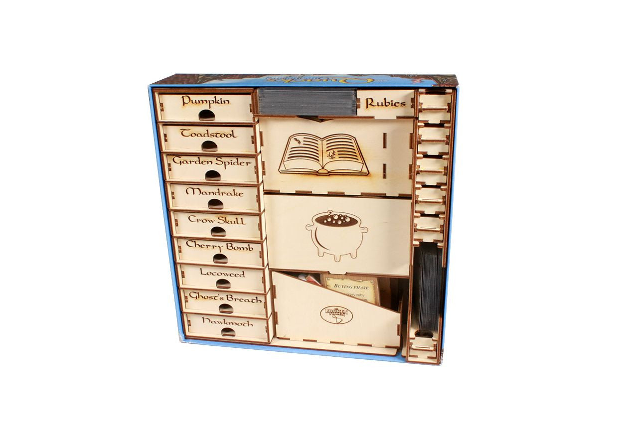 Don’t let your pot explode! Brew the perfect potion with a little help from The Broken Token! This unique apothecary organizer allows you to play straight out of the box and has a place for everything. 9 engraved drawers for all your ingredients, 6 mini drawers for individual tokens and chips, 1 dedicated tray for your rubies and multiple compartments to store your cards, player boards and bags.