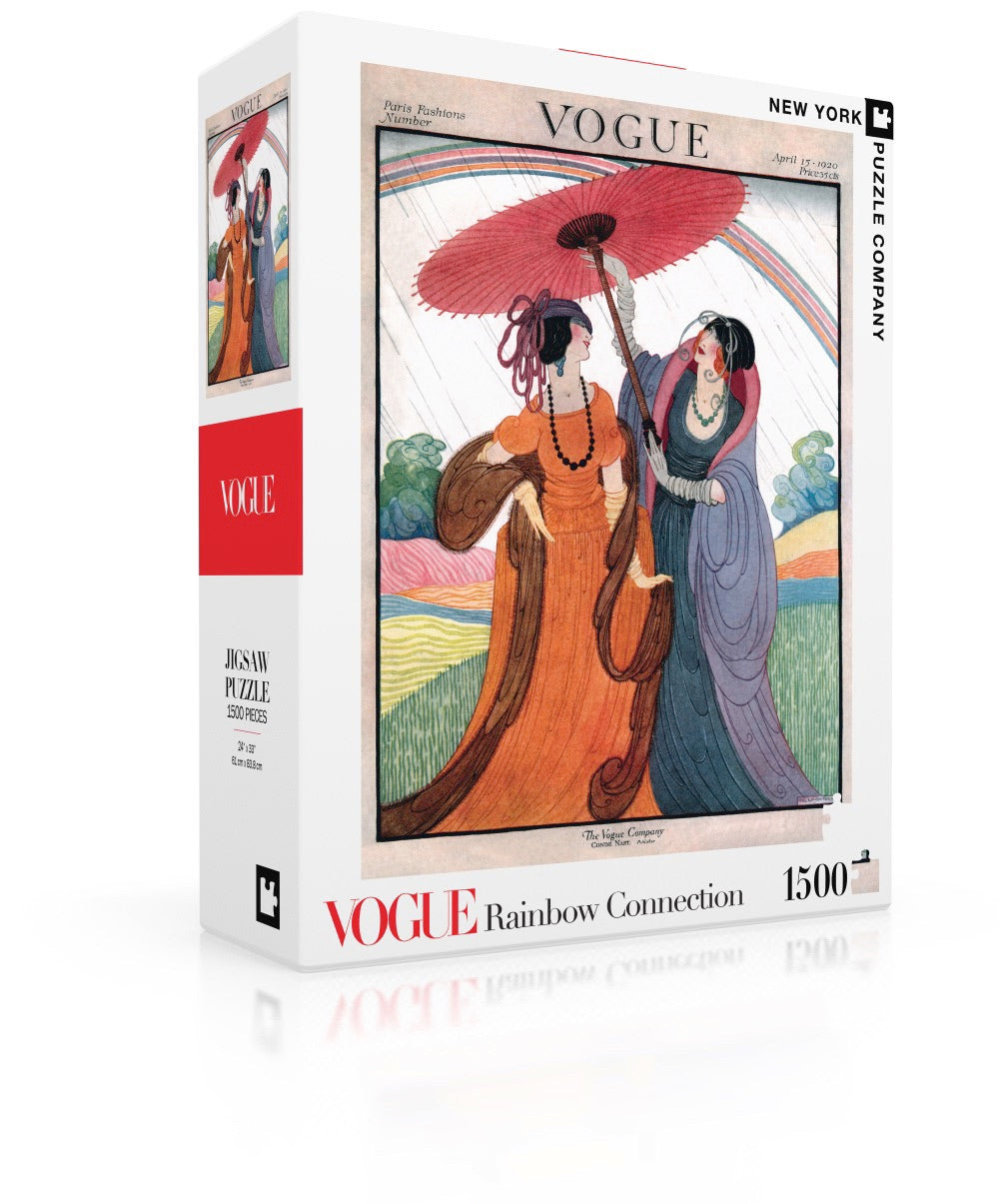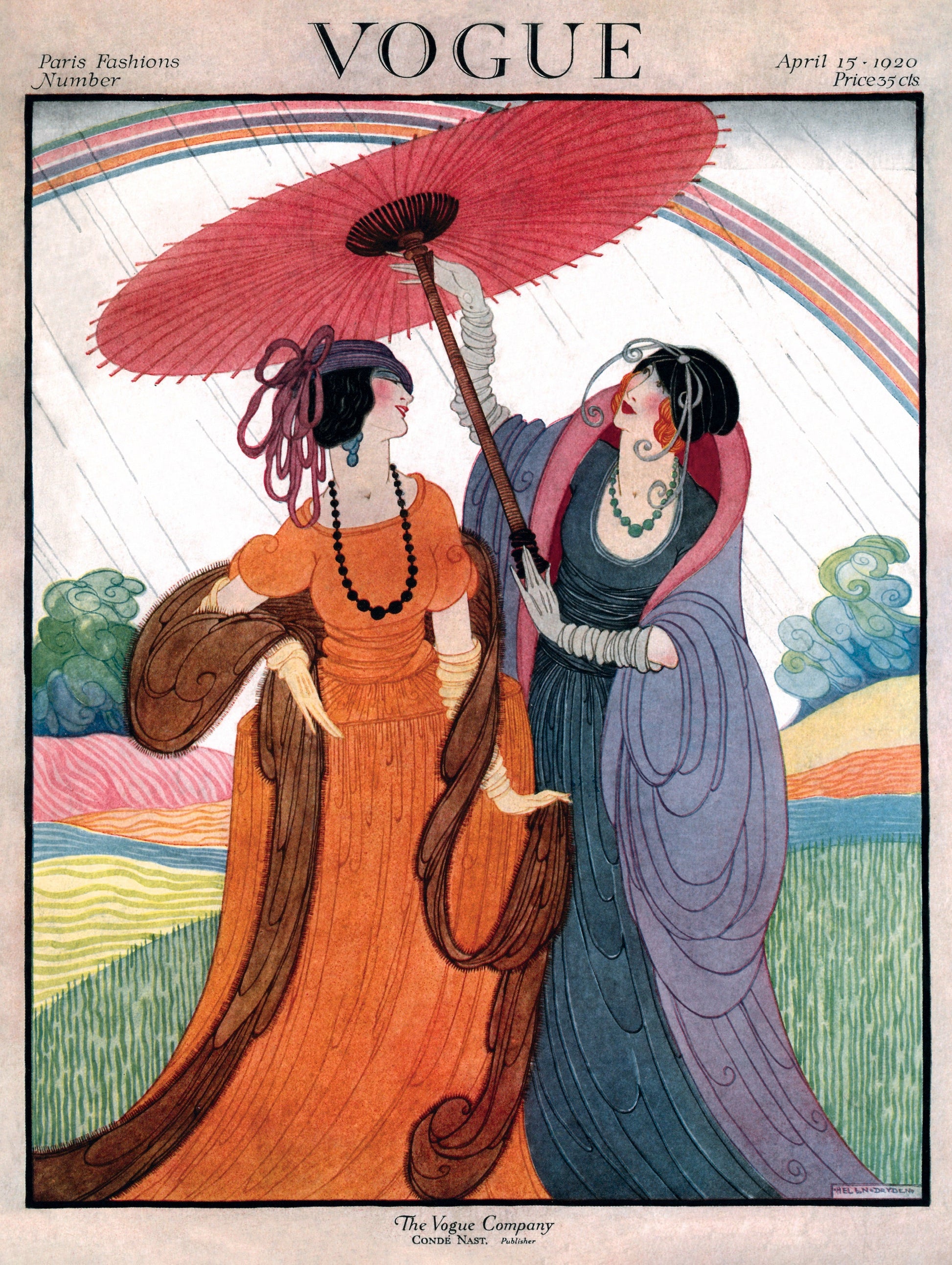 Making a rainbow connection on the cover of Vogue’s April 15, 1920, Paris Fashions Number are two beauties—, drawn by the confident hand of Helen Dryden—, sheltering from the rain under a broad parasol. They are, of course, dressed in the latest fashions. “Whether or not the mode of full skirts is accepted as a whole, at least there is still preferred for affairs of a certain sort that costume slightly puffed about the hips” (like the cayenne-colored dress at left),” Vogue reported from Paris. “Such frocks are chosen for afternoons, for the races, perhaps, or for a garden party. For this type of frock, of course, a suitable coat or wrap had to be created. These wraps have naturally a hint of fancy- dress about them, but all the same, they are practical, and they are very new.” Not to mention, cover-worthy.