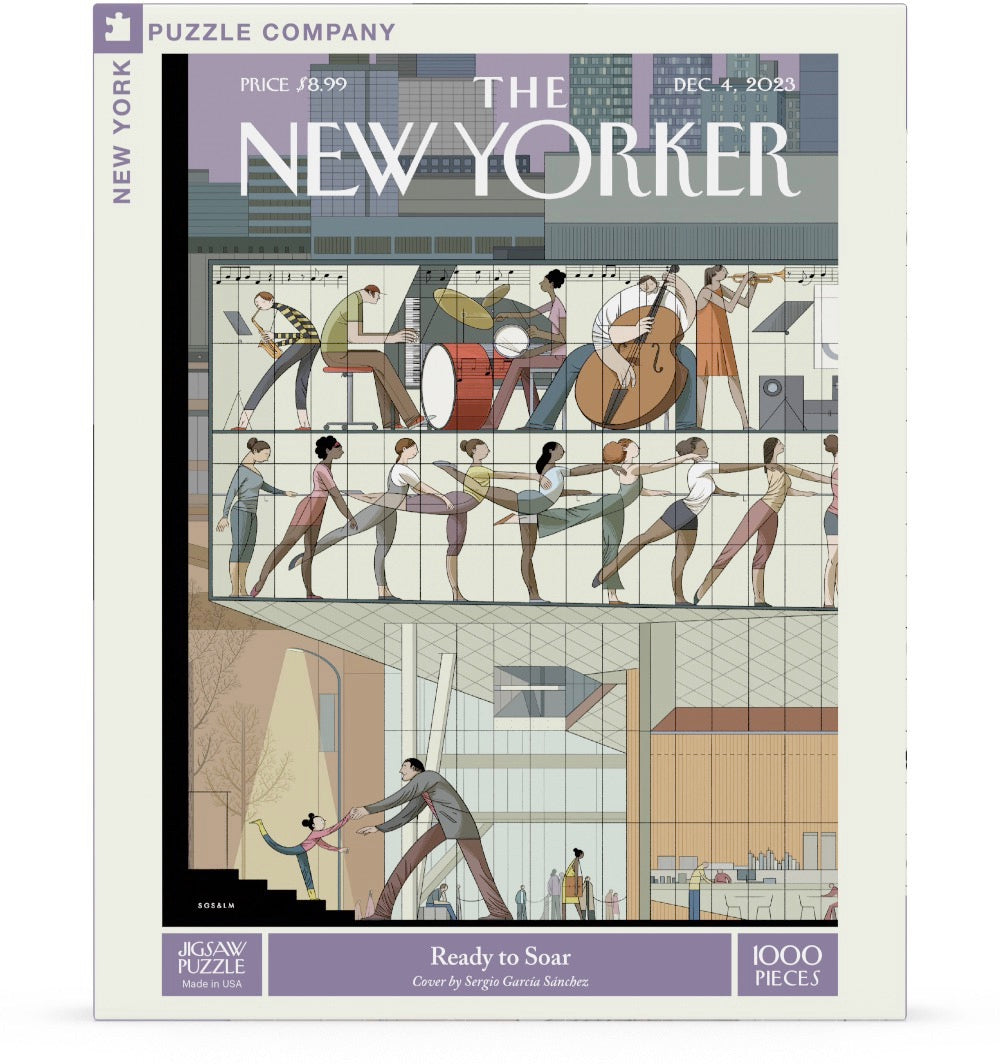 Step into a world of art, music, and heartfelt connection with Ready To Soar, a 1000 piece jigsaw puzzle featuring the captivating December 2023 cover of The New Yorker. Set against the iconic backdrop of New York City and the renowned Juilliard School, this stunning artwork brings to life a diverse group of dancers and musicians, each filled with the energy and passion of performance. Amidst the rhythm and movement, a touching scene unfolds—a tender moment between a man and a young child dancing together, capturing the essence of joy and human connection. Perfect for puzzle enthusiasts, art lovers, and anyone who cherishes the beauty of music and dance, this puzzle offers an inspiring challenge. As you piece together the vibrant performers and the city that frames their world, you'll find yourself immersed in a celebration of creativity and the boundless potential of the human spirit. Discover the magic of Ready To Soar, one piece at a time!
