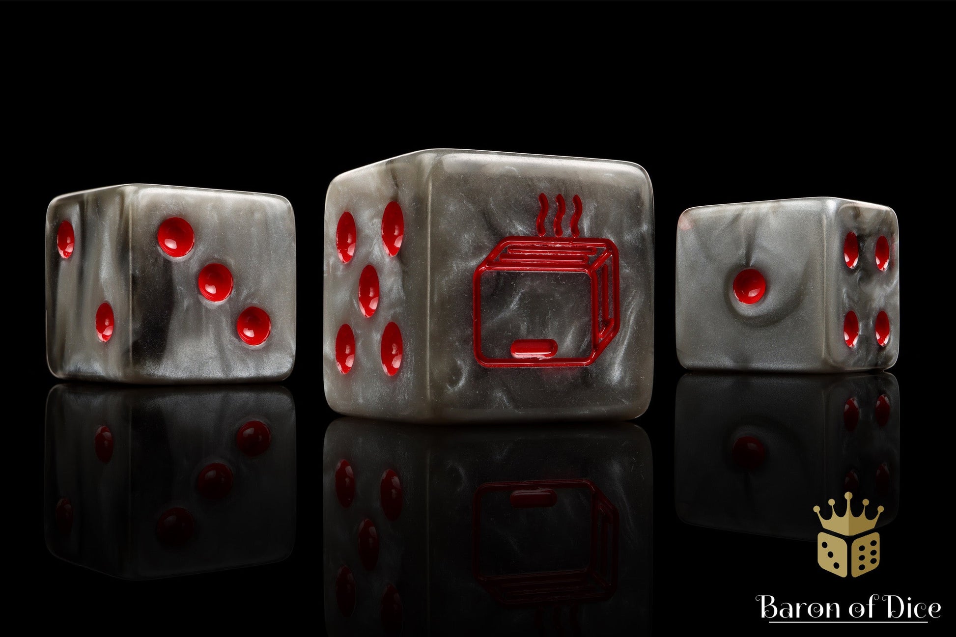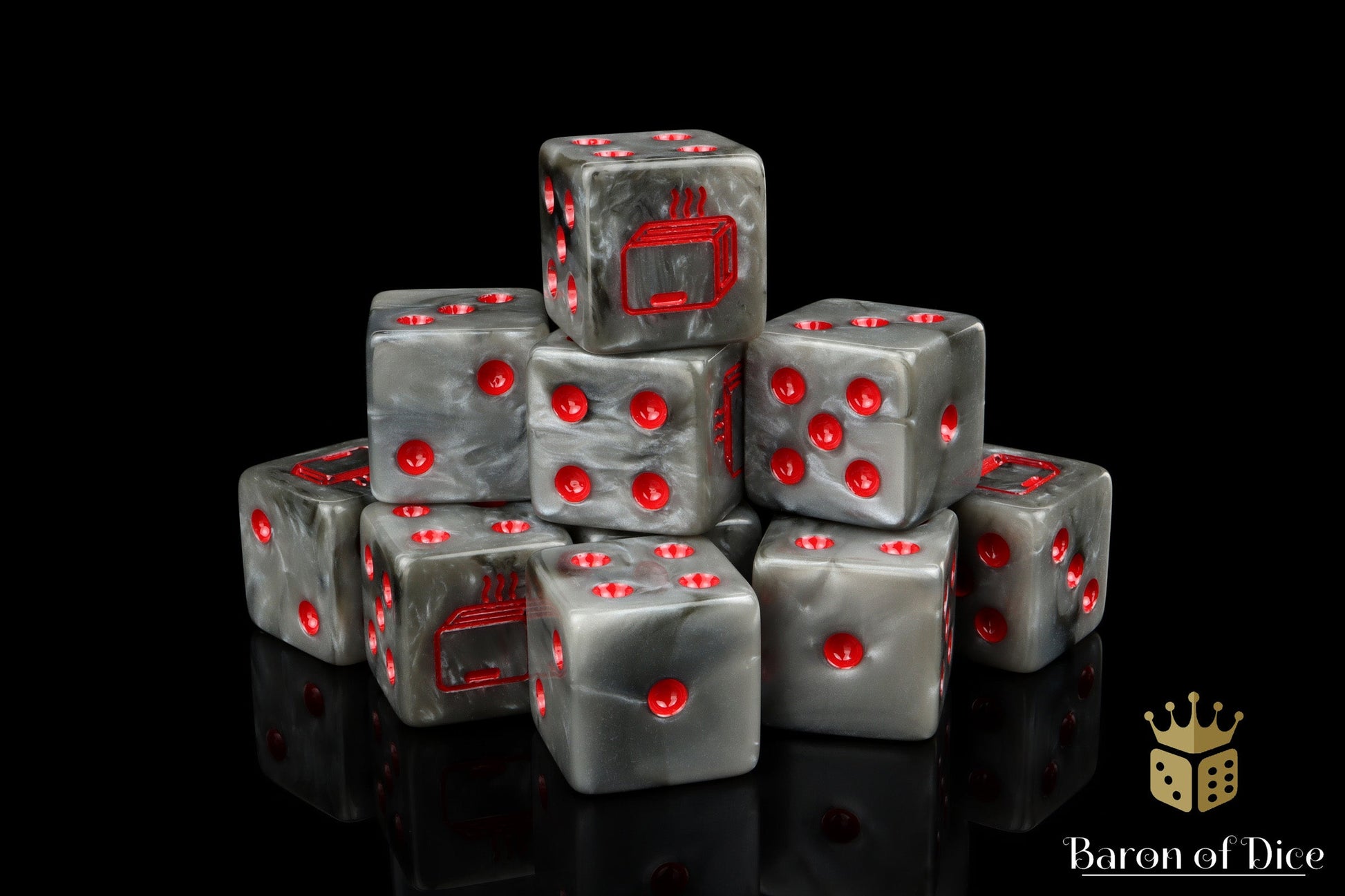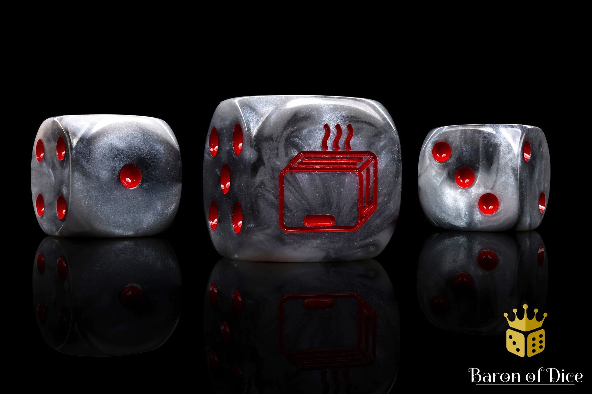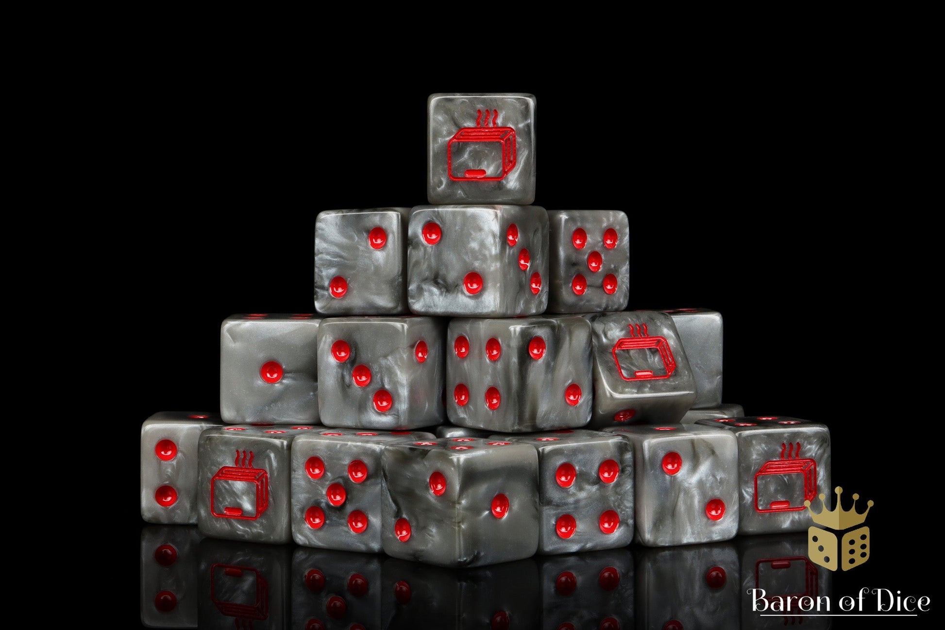 These contain a mix of machine oils swirled with smokey whites and inlaid with bright red; resin 16mm dice. The symbols are on the 6 side. These dice have an option of round or square corner, choose wisely! Our premium dice now come in a unique reusable tin.