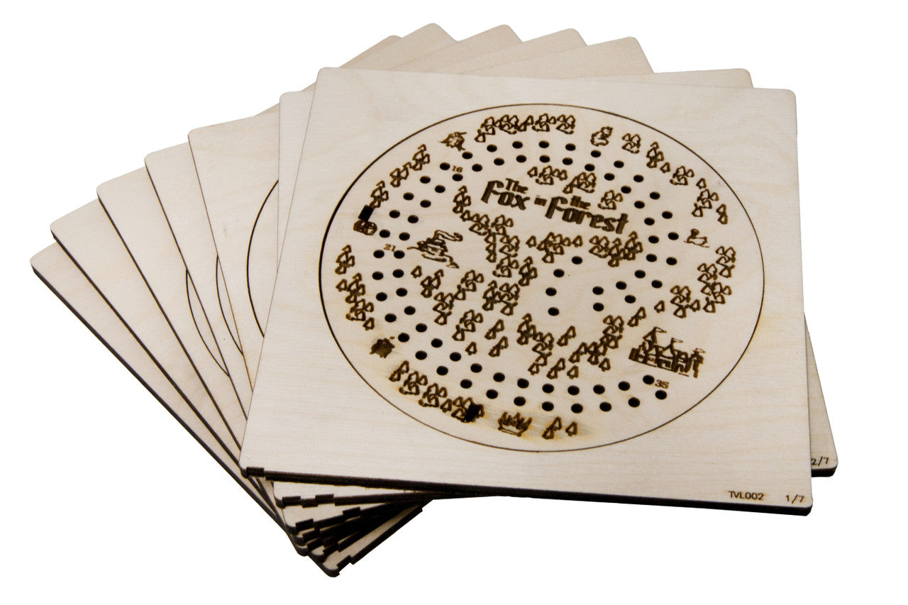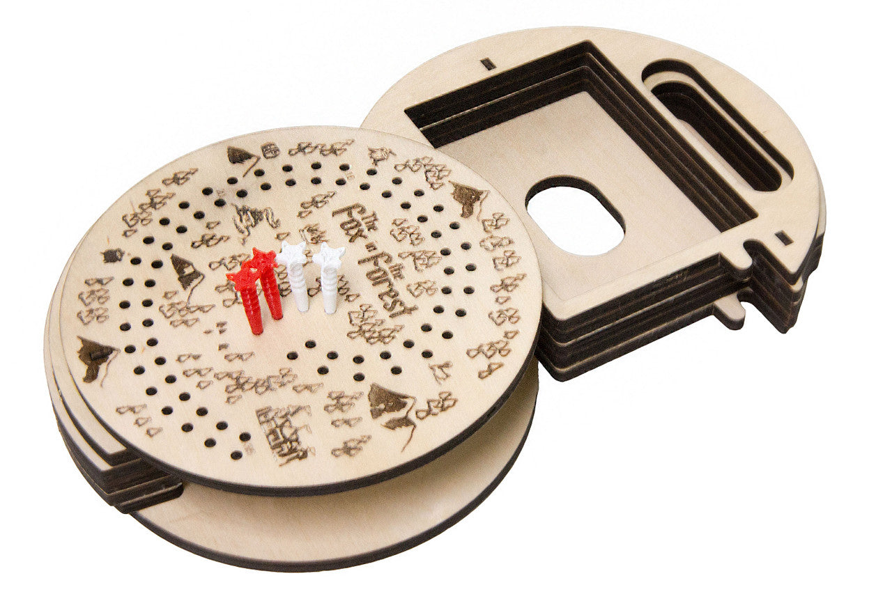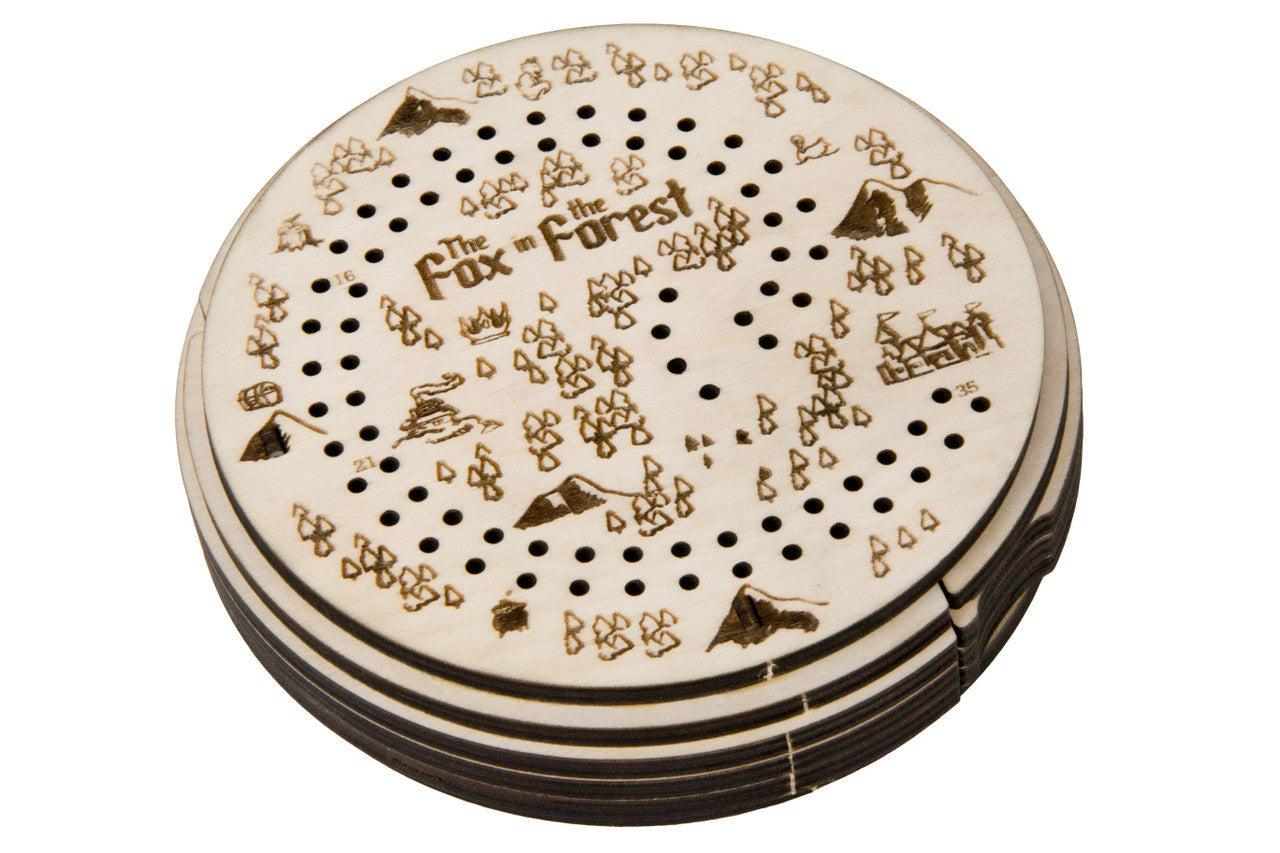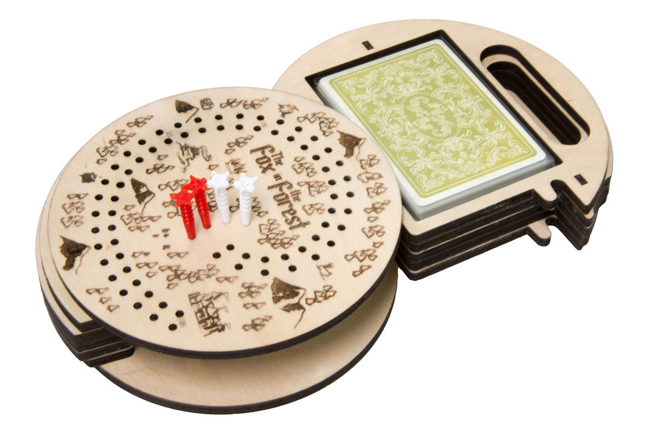 This travel kit houses all cards from the game sleeved or unsleeved, and is engraved with thematic art and a scoring track. This feature combined with the included fox themed pegs allows you to store and play The Fox in the Forest without the original box or scoring tokens; perfect for the car, plane, train, or cafe.
