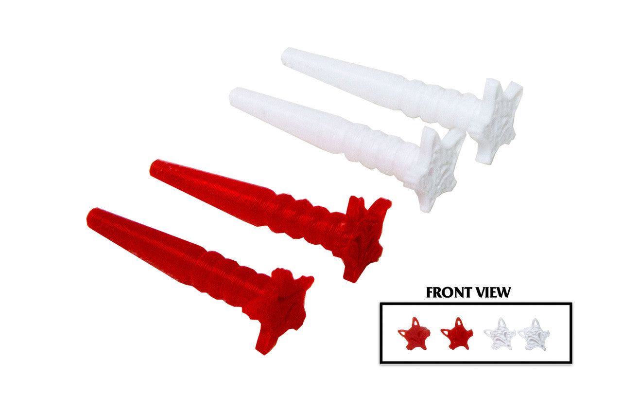 Includes two red fox pegs, and two white fox pegs, which set right into the top of the case.