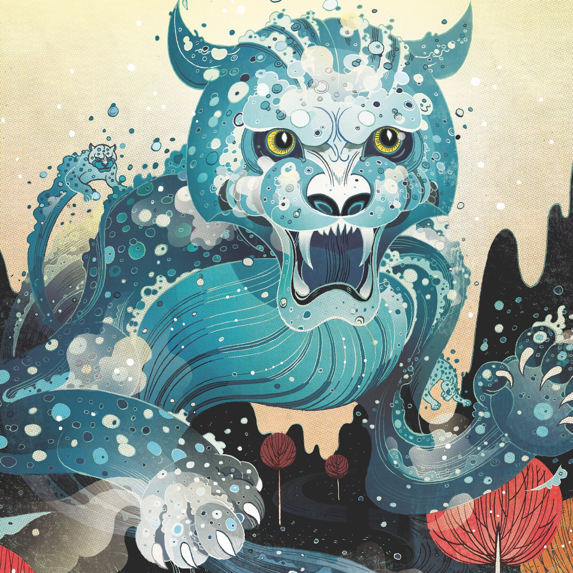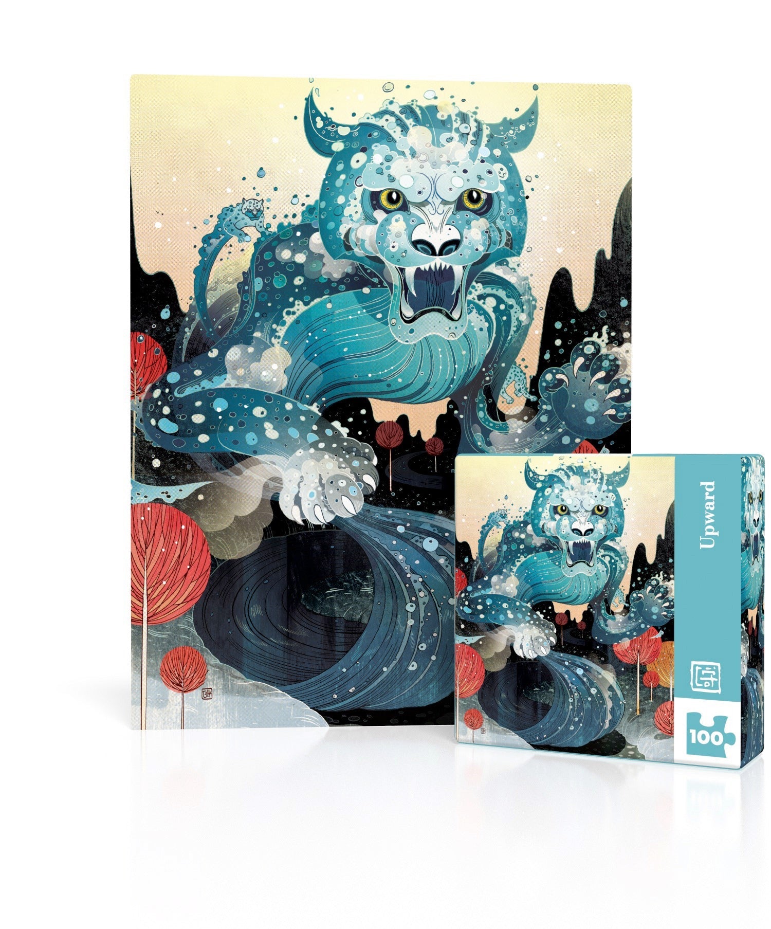 A majestic feline formed entirely of water embodies the power and rush of a mighty running river. Victo Ngai's fluid and dynamic composition captures the essence of nature's strength and movement, creating a captivating and imaginative scene that will enchant puzzle enthusiasts of all ages in this 100 piece mini puzzle.